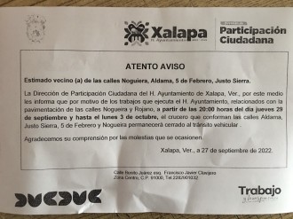 2022-09-29 - Por trabajos de pavimentación, las calles Noguera y Rojano estarán cerradas a partir de las 20:00 horas de este jueves, hasta el lunes 3 de octubre